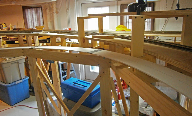Turnouts, turnouts, everywhere. And curved turnouts at that. I haven't posted in a while because I have been spending every available hour (which aren't many) either working on the layout, or building projects for the LaunchPad for Model Railroading blog.