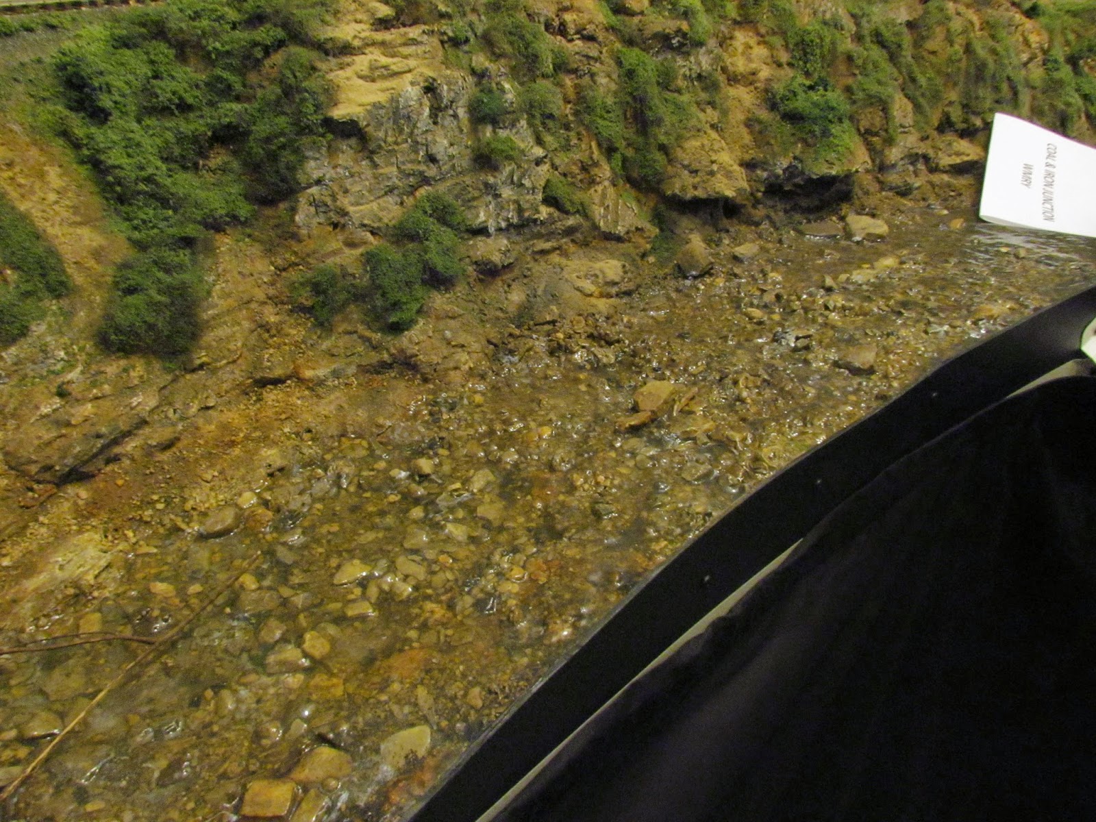 Since this was my first trip to see Warren’s work “in the flesh”, I could not ply him with enough questions to glean any significant insight into his scenery techniques. Some highlights – his rocks are hand carved (although I prefer castings); water is made with successive pours of gloss Mod Podge; coloring is done with craft store acrylics and some of the hanging vegetation is poly fiber teased out and covered with ground foam. On the scale between “impressionistic” and “photo realistic”, Warren’s work is either dead center or a tick towards photo realism.